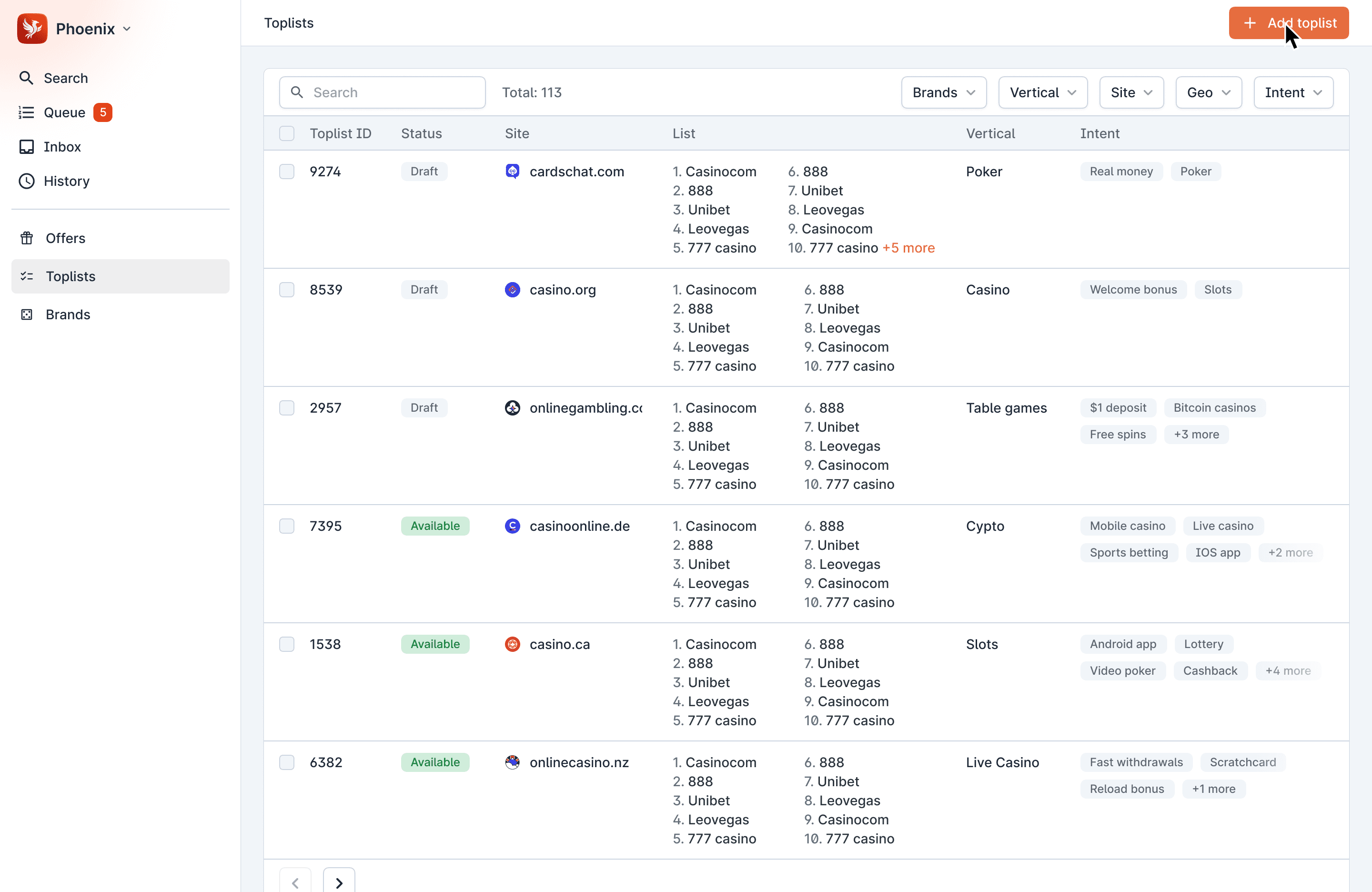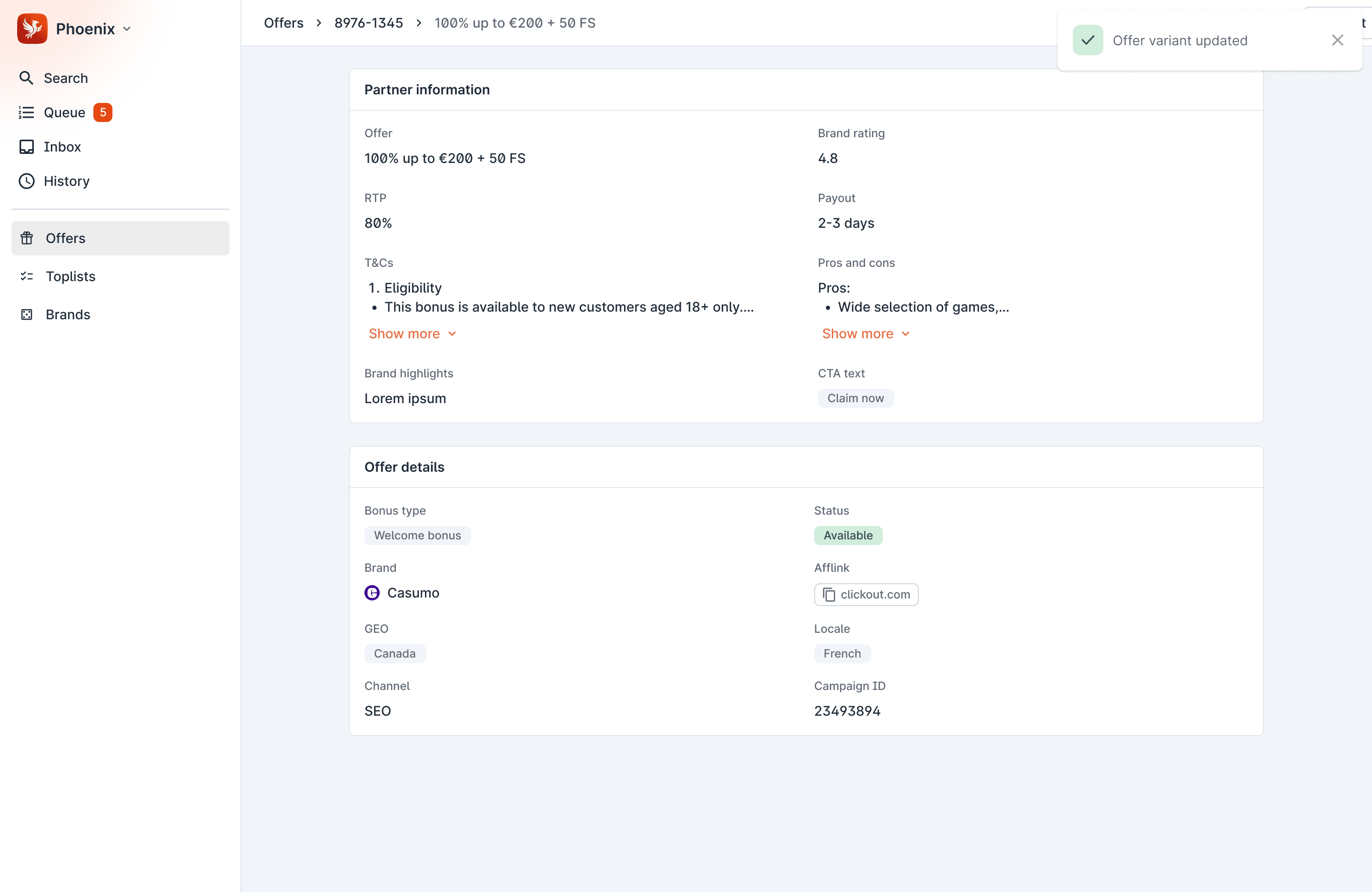 The original product had grown from a proof-of-concept straight into production, becoming brittle, bloated, and unable to scale with Legend’s growth. Maintenance was manual and time-consuming for Commercial Ops, and unstructured data limited toplist functionality and optimization. Phoenix Next Gen was rebuilt from the ground up to match offers with user intent while reducing administrative effort.