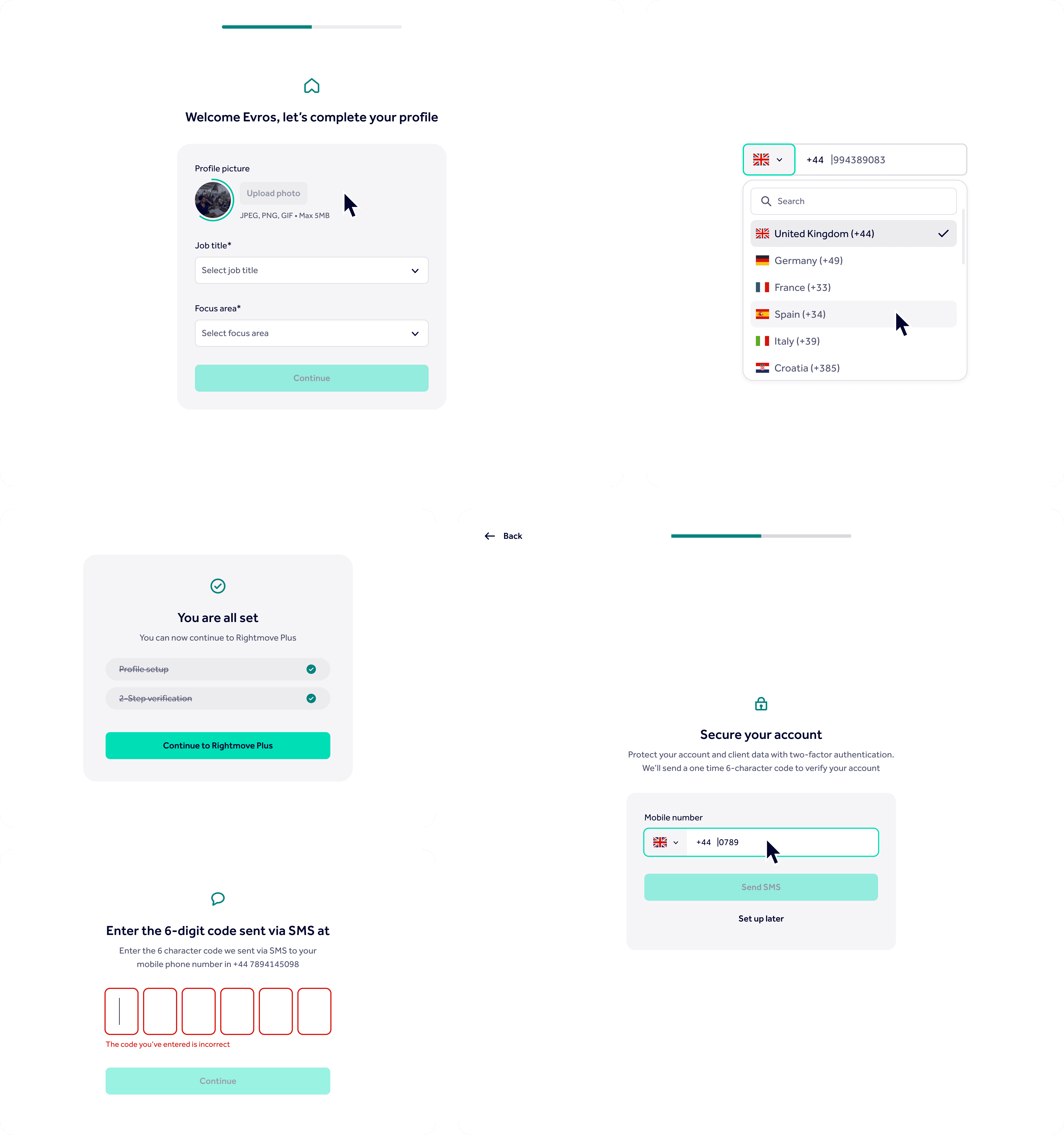 In 2024, I led the design of Rightmove Plus’ first onboarding experience. We wanted to make the first steps smoother, get more users on two-factor authentication, and understand our users better by capturing more information like job role and focus area, to deliver a more tailored experience across the platform.